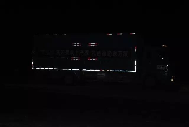 沿途配送路上,鲜有车辆路过,这辆车在夜色中行驶,反光贴隐约闪出灯光。