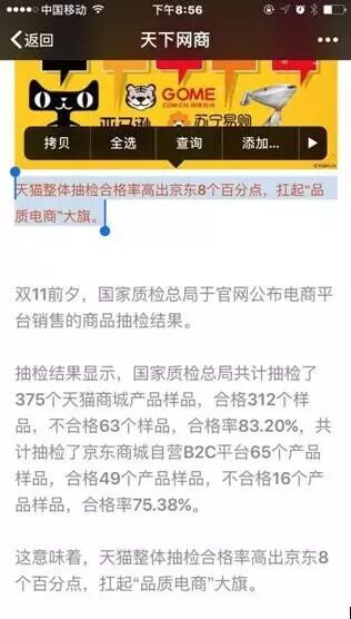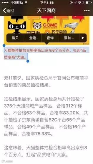 文中援引双11前夕,国家质检总局于官网公布电商平台销售的商品抽检结果,并信誓旦旦的做出了结论——天猫整体抽检合格率高出京东8个百分点,扛起“品质电商”大旗。