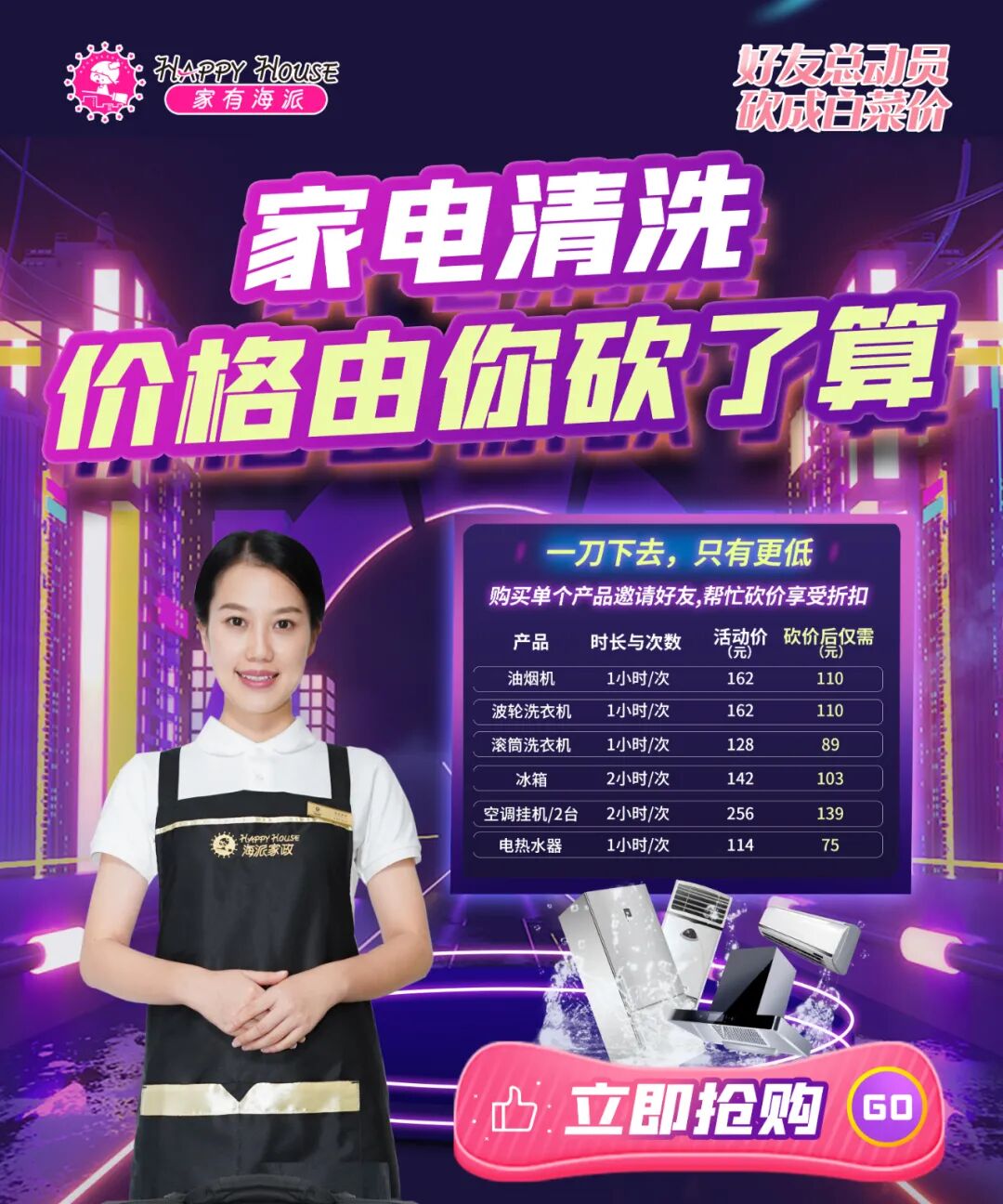导读:HAPPYHOUSE家电砍价福利大放送活动介绍1.点击上图即可前往家电清洗专区挑选所需产品2.选中所需产品邀