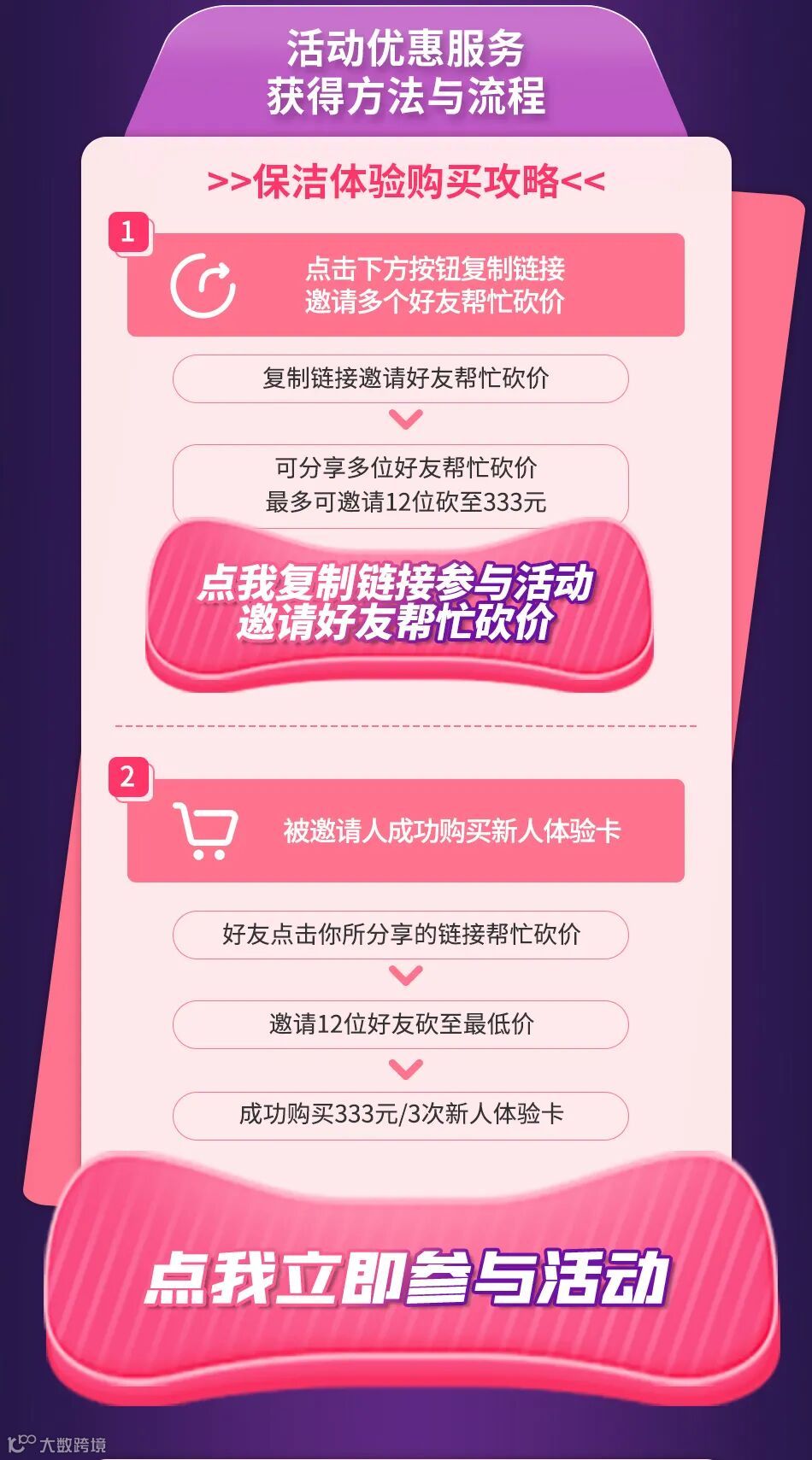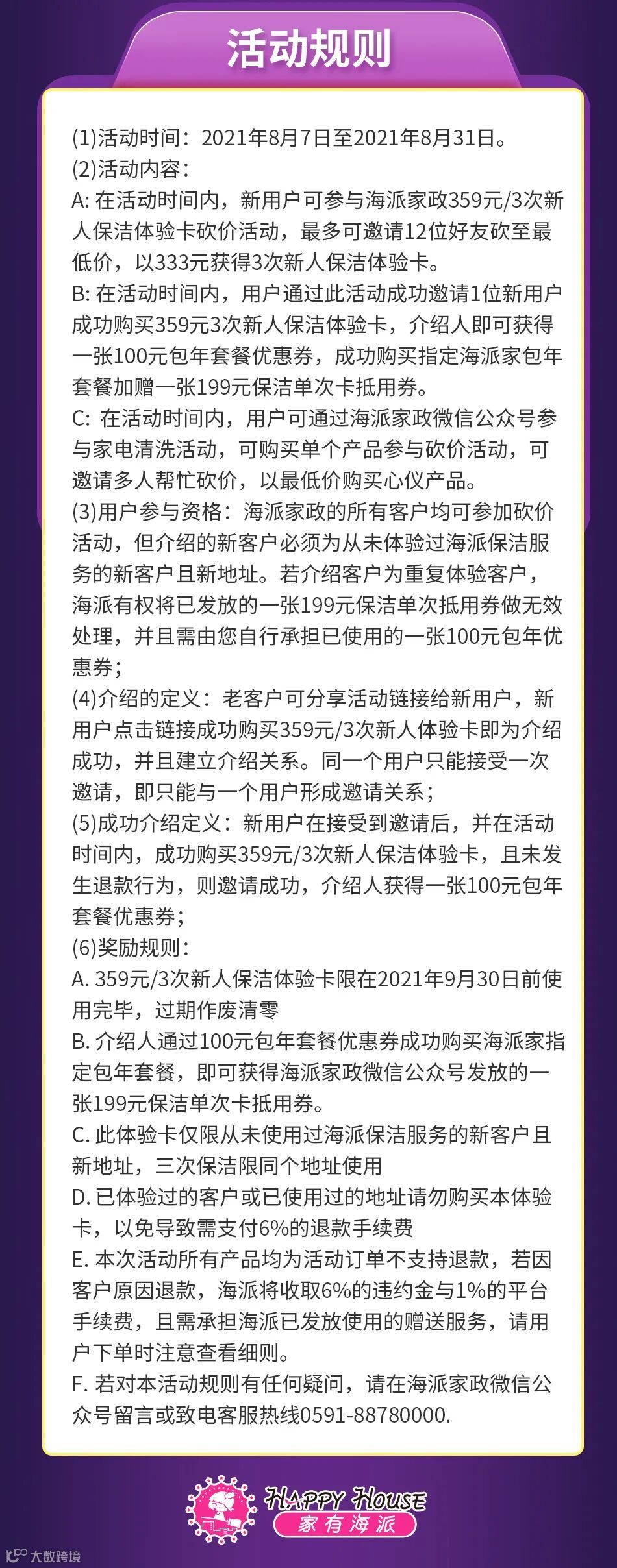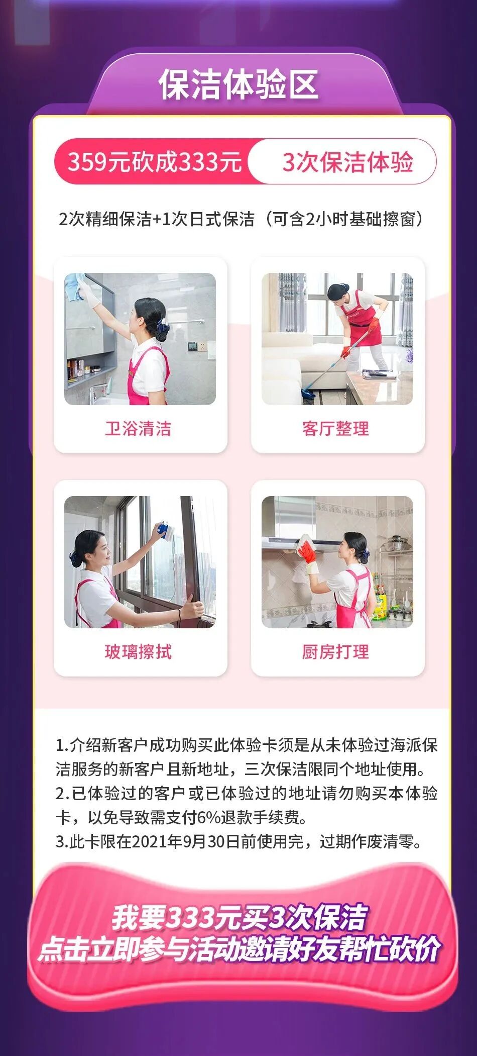 1. 本次3次体验卡砍价活动仅限从未体验过海派保洁服务的新客户且新地址可购买此卡。