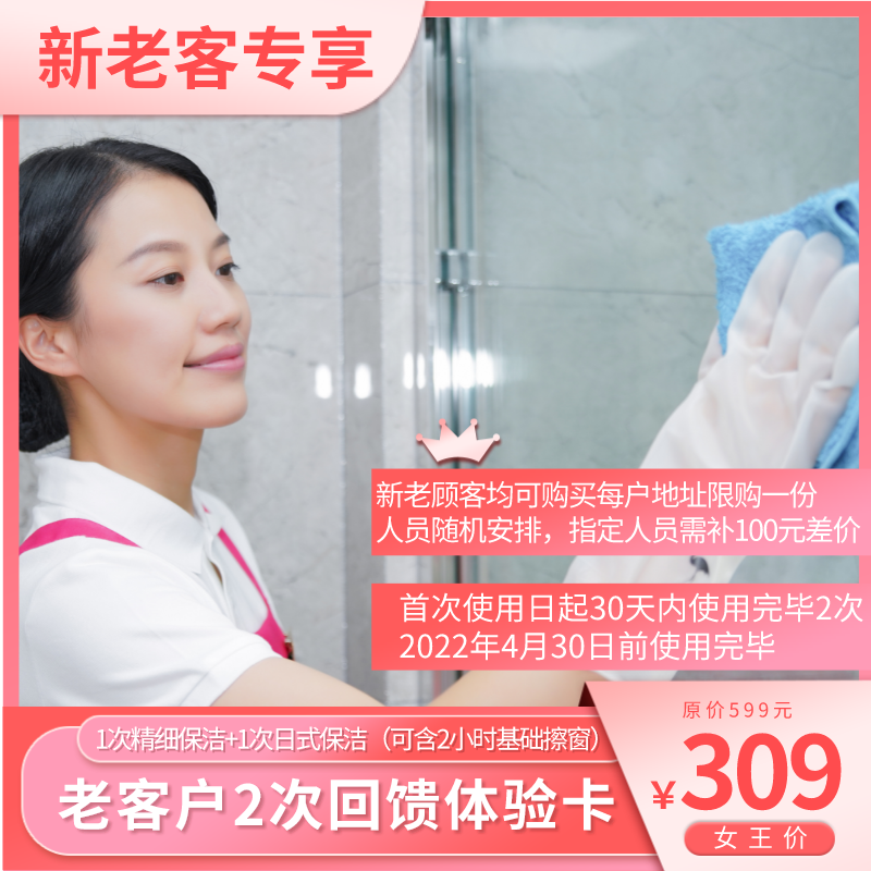 【3.8女王回馈卡】309元2次保洁体验带回家,新老客均可购买~