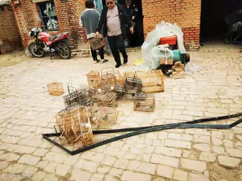在山东济宁嘉祥县发现两处捕鸟网盗猎点,网上有20余只野生鸟死体,举报后协助执法部门销毁捕鸟网,警方立案调查。协助相关部门暗访贩卖野生鸟窝藏点,解救云雀等野生鸟38只,收缴盗猎工具打笼等。