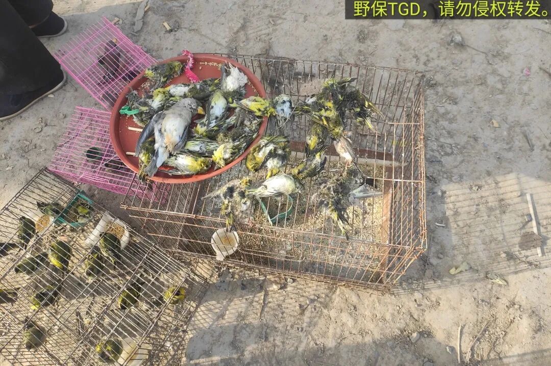 在山东省临沂发现、举报两处集市非法贩卖野鸟,举报后配合公安执法部门查获野生鸟共250余只。