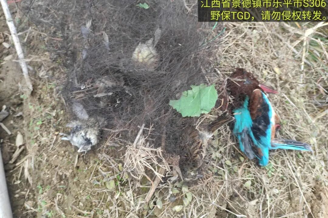 在江西景德镇市乐平市,发现多处捕鸟网,报警后与地方执法部门共同销毁捕鸟网100余米,非法架网者两人被调查处理,举报菜市场贩卖野鸡一人,公安立案调查。