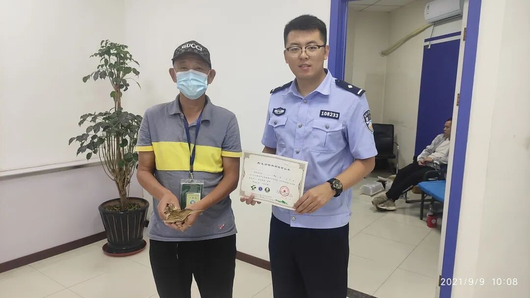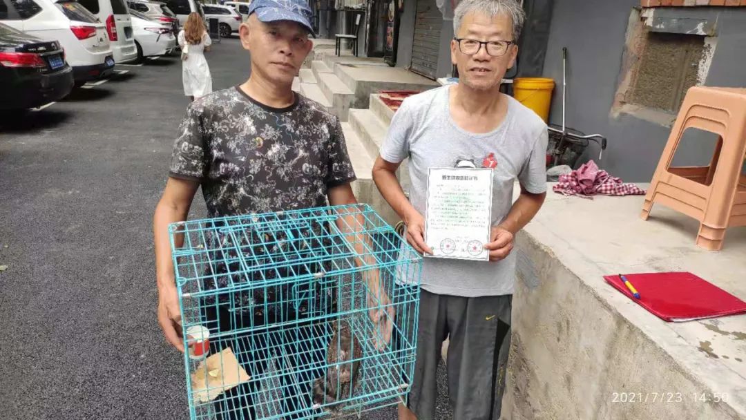 巡护山东潍坊一集市场,宣传警示牌下有人公开贩卖野生鸟,举报后与执法部门共同查获收缴国家二级保护动物画眉、红胁绣眼鸟13只,“三有”保护动物黄雀、腊嘴雀等野生鸟49只,贩卖者被公安部门立案调查处理。