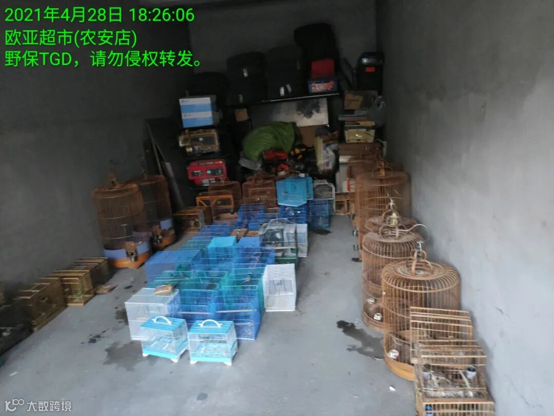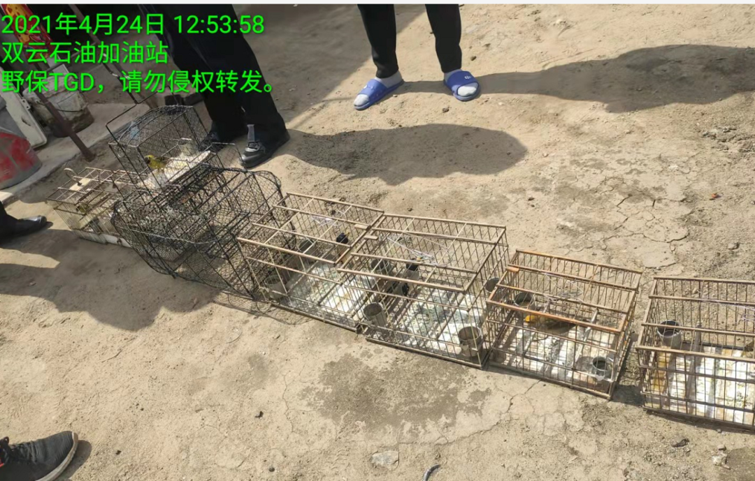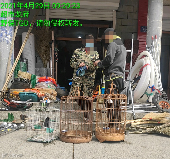 懿丹野保特攻队东北分队,在辽宁沈阳市抚顺新区发现两家鸟店非法贩卖国家二级保护动物鹩哥、画眉、云雀、红喉歌鸲等野生鸟,举报后相关部门收缴61只野生鸟和14个滚笼等盗猎工具,案件等待进一步调查处理中。