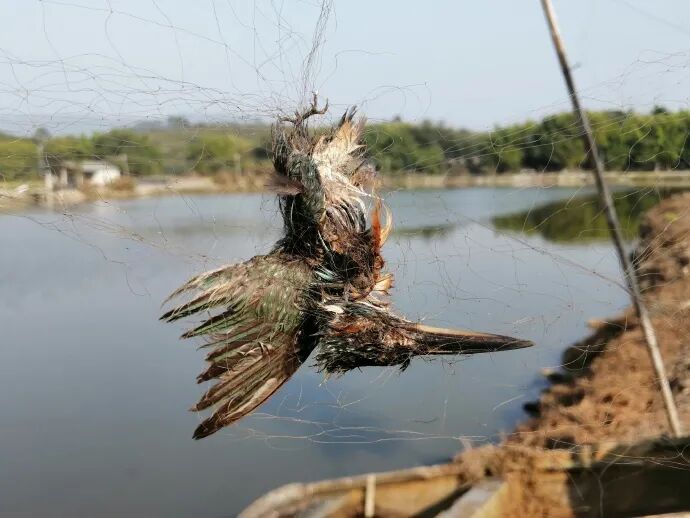 在广东佛山三水区龙岗古屋附近的鱼塘,懿丹野保特攻队发现两张捕鸟网,网上有翠鸟等三只野生鸟死体。举报后执法人员到现场调查,并拆除捕鸟网。另外志愿者在附近六一村发现一张护菜园子的捕鸟网,向菜农普法宣传后拆除。