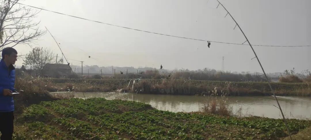 在江苏盐城市射阳县协助相关部门处理前一天发现的野鸭盗猎点,将数个水塘中的扣鸭网拆毁,放生野鸭20余只,将捕猎者非法建造的鸭棚等拆除。