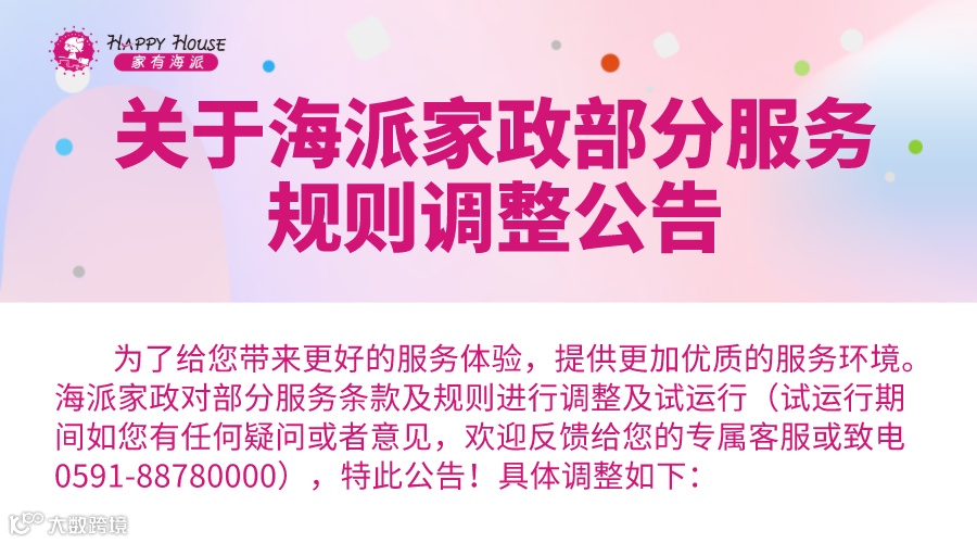 当您预约服务后,海派支持您通过“海派家政”公众号及海派客服热线0591-88780000做服务咨询与反馈及服务时间的调整,详情以每期活动明确服务说明为准。