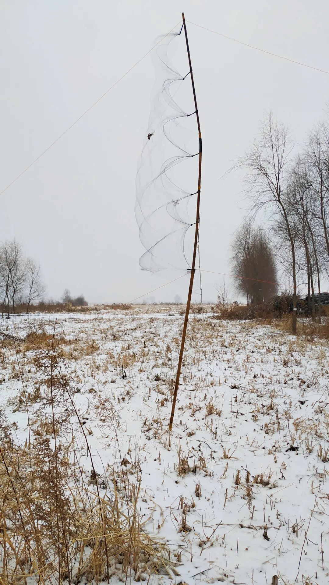 据摄影爱好者提供信息,在吉林省长春市榆树市环城乡某一野外慌地处,发现有一处非法捕鸟网。王队长、一梦、长征、智利硝石4名志愿者不顾气温骤降到零下20左右度的寒冷,顶风冒雪到达现场,发现该网长约15米,高约4米捕鸟网,网上还有一只麻雀死体。