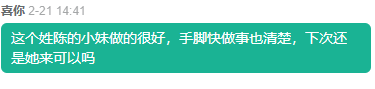 “我看到郭芳姐姐的一个状态,她好像真的热爱家政这份工作,我听到她给我介绍的时候她的脸上都是骄傲和自信,我渴望得到一个证明自己的机会”