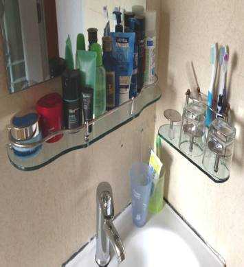 洗漱、化妆瓶、肥皂盒标签、喷嘴统一由大到小、朝外摆放