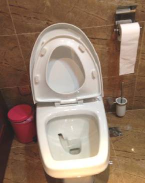 ☞ 1.黄色保洁布从上到下擦洗水箱表面马桶盖表面,内面瓷砖刷刷洗边缝脏污