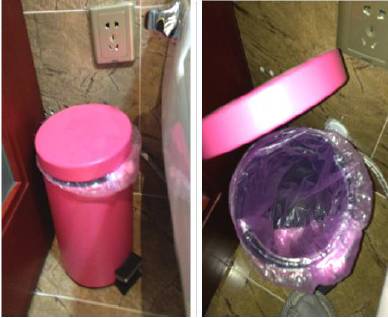 ☞ 2.粉色保洁布擦拭窗台上的沐浴用品瓶身、底部无灰尘,无水痕由大到小,喷嘴,标签统一朝外摆。