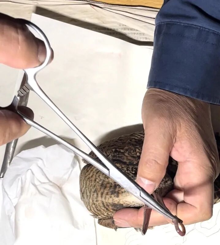 傍晚,军老师接到丘鹬。通过检查,军老师诊断牠的撞伤不是很严重,头部没有明显伤,只是眼部有一点充血,喂点水和蚯蚓之后静养一晚,隔日便可放归自然。