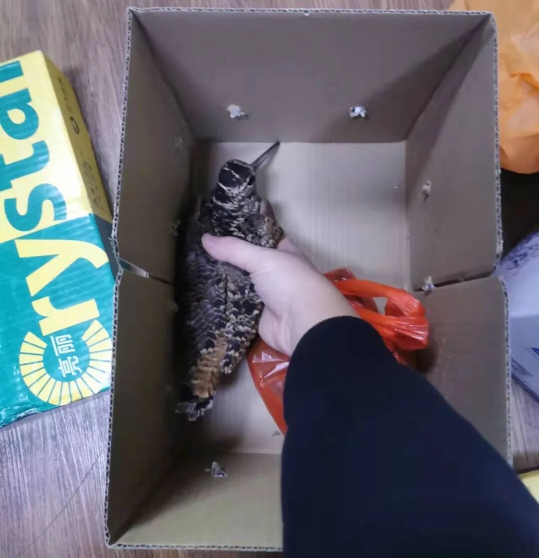 这只丘鹬是上海某小区物业的工作人员捡到的,看似是撞伤,鼻孔有些出血。工作人员随即联系了让候鸟飞的志愿者们,并把小鸟安置在纸盒里面静静等待。