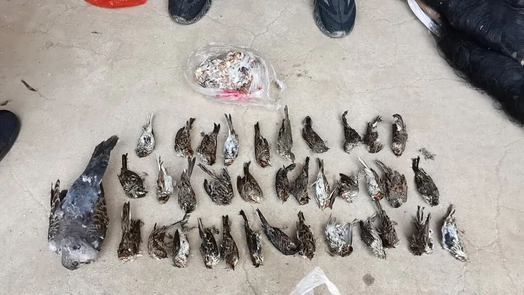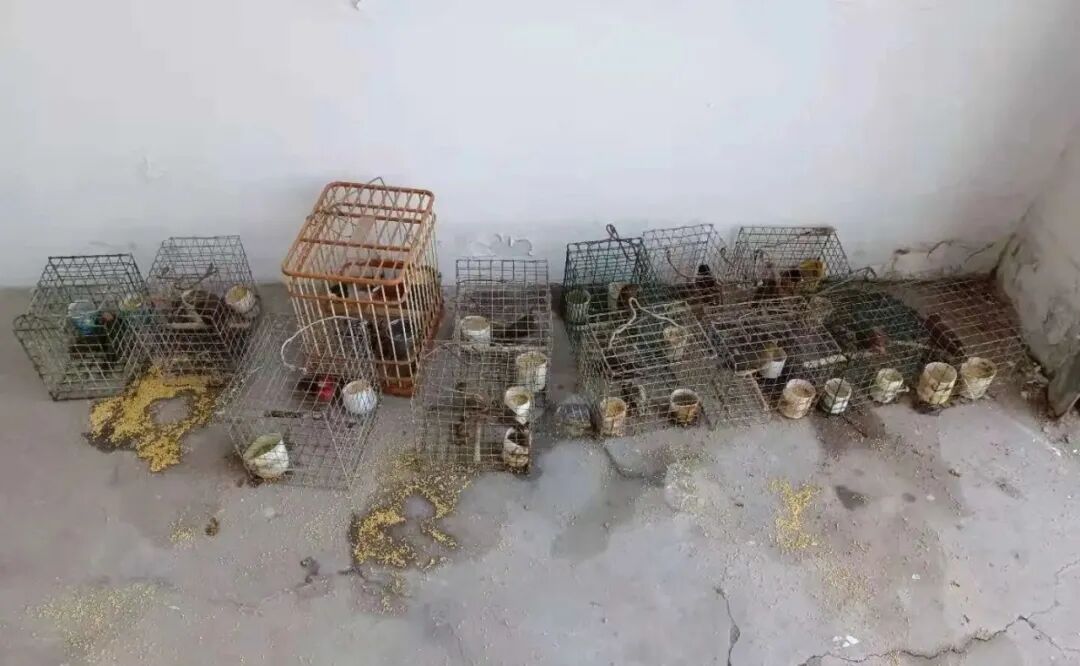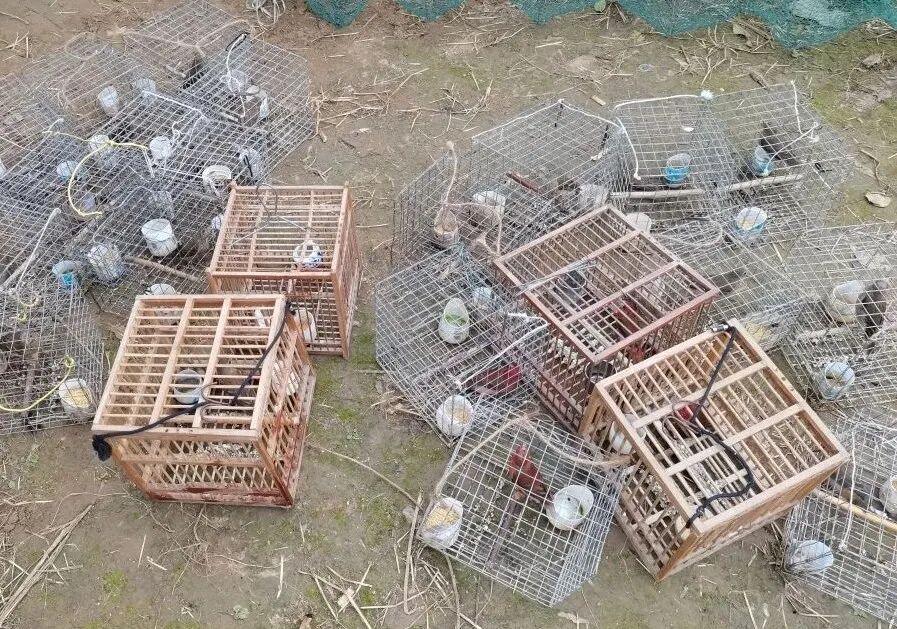 东沽港派出所出警后,经搜查在农田里发现7列捕鸟网近700米长;20多个装着诱捕鸟的鸟笼;3个声音诱鸟器。据现场志愿者统计,在多层鸟笼中装着的鸟类有:朱雀、黄眉鹀、绣眼鸟、柳莺,还有国家二级保护动物红喉歌鸲。