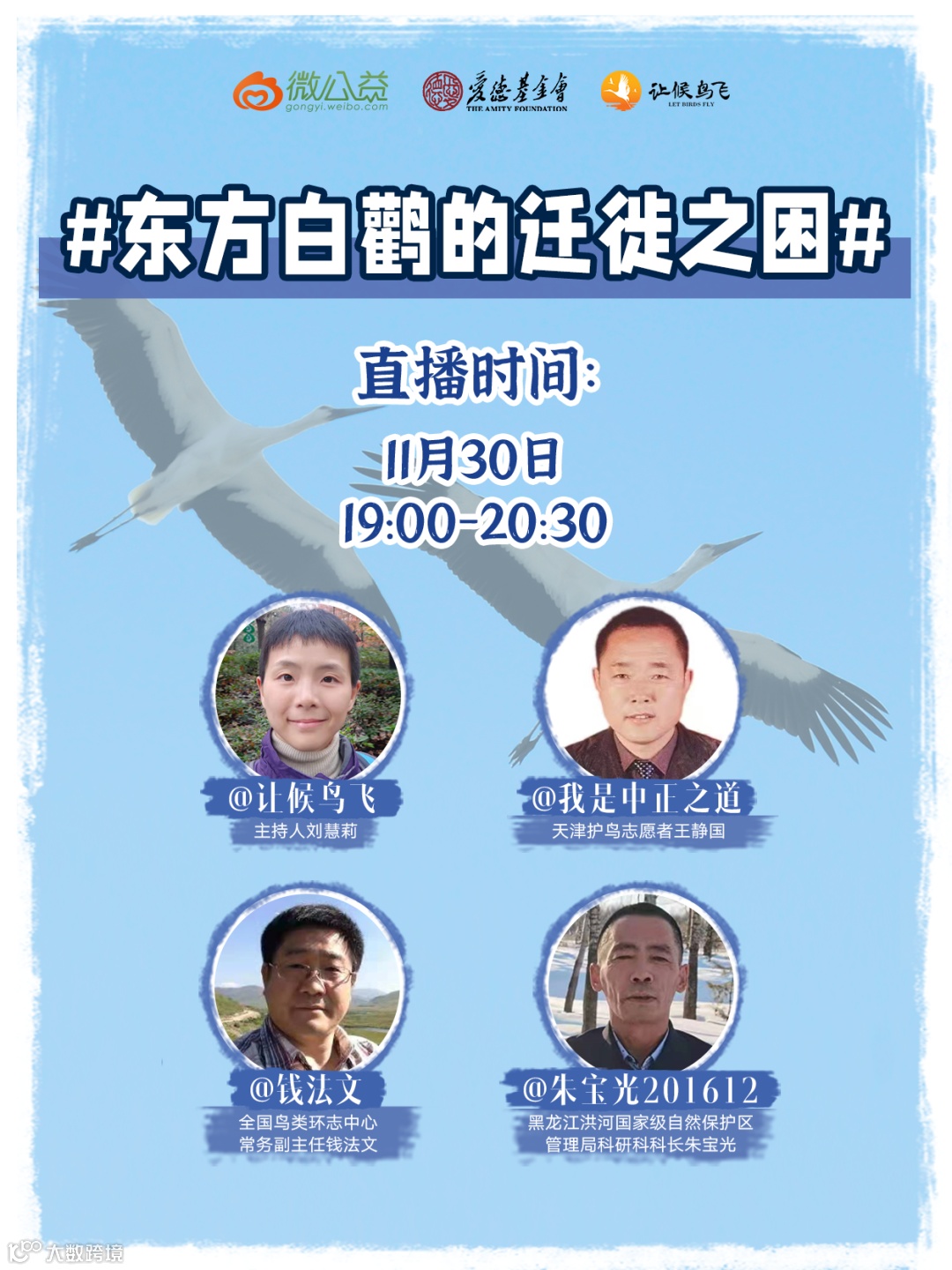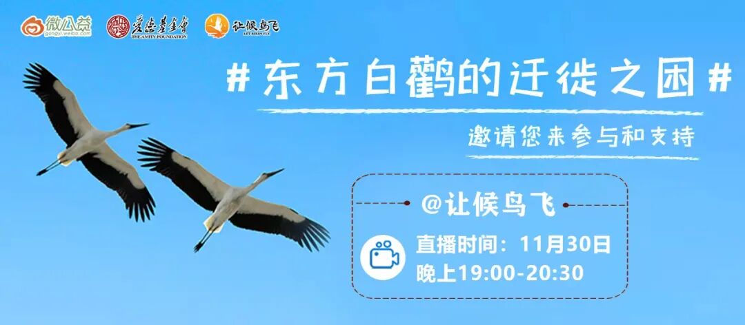 11月30日,周二晚19:00-20:30,我们邀请到全国鸟类环志中心常务副主任钱法文@钱法文 、黑龙江洪河国家级自然保护区管理局科研科科长朱宝光@朱宝光201612 、天津护鸟志愿者王静国@我是中正之道 三位嘉宾,一起与您探讨如何保护这个珍稀物种,欢迎来候鸟直播间(新浪微博@让候鸟飞)看直播!