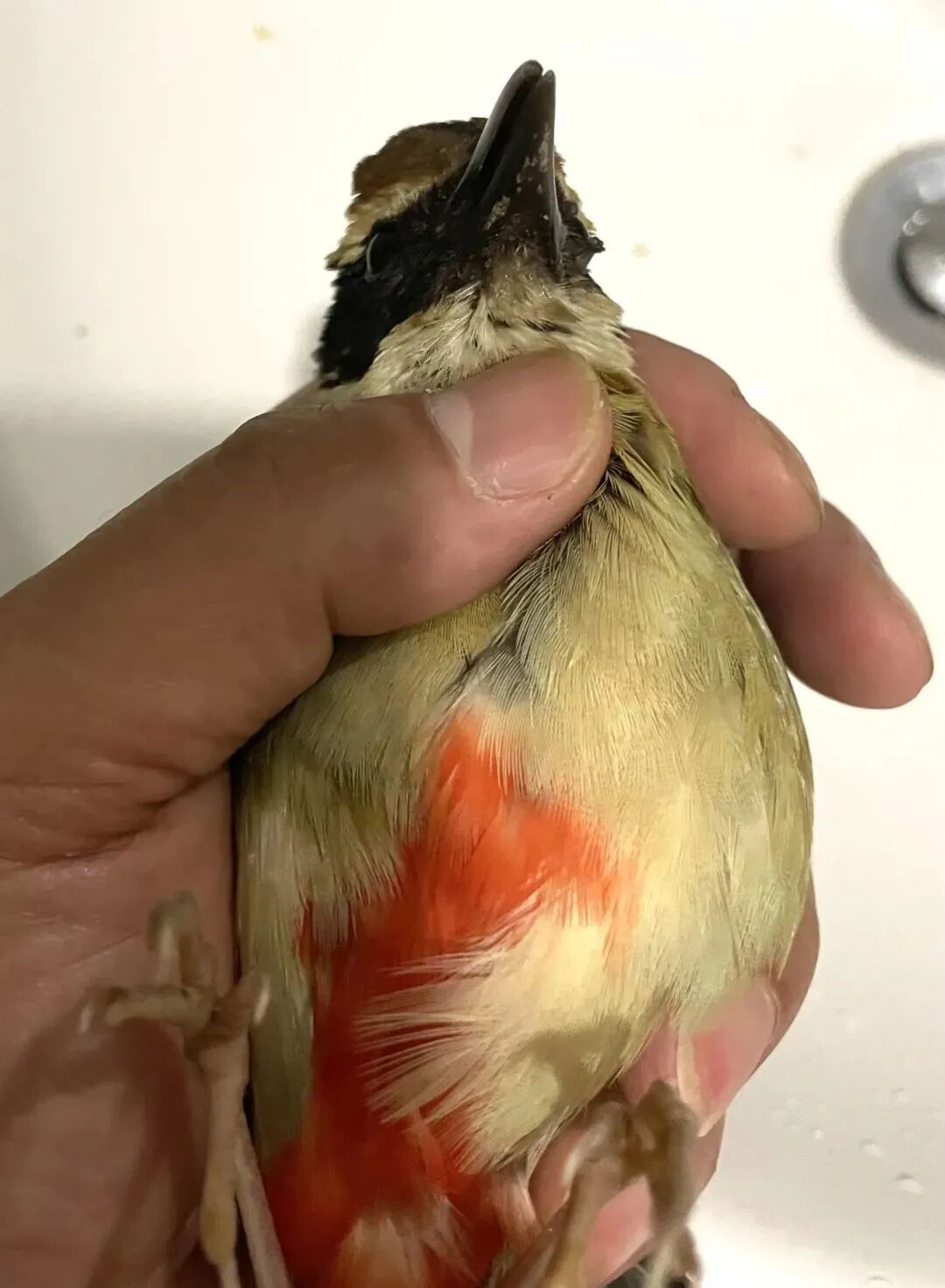 “它是连撞两次玻璃。第一次撞晕之后,它还没有醒,起飞后又撞墙了,然后就直接掉地上了。我检查身体之后发现它把上下颚给撞歪了。”