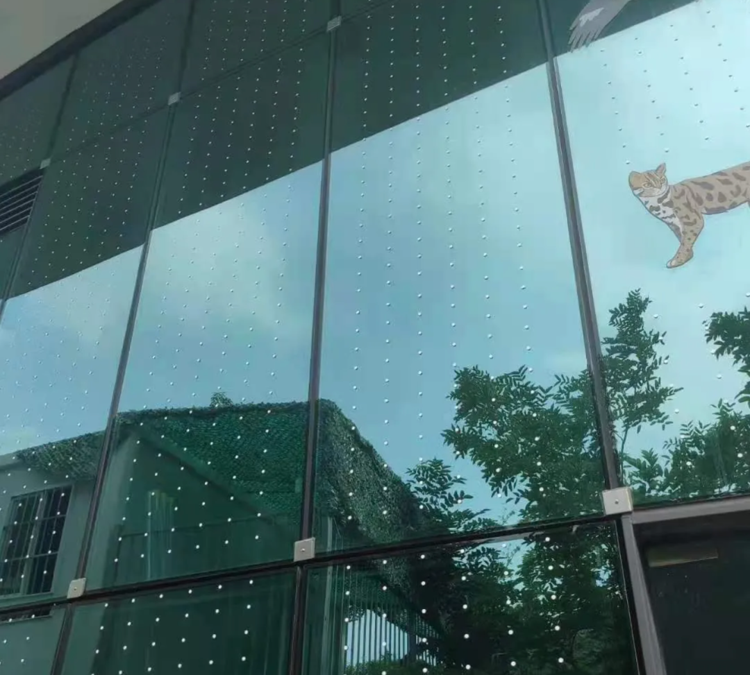 一个最直观的改变就是,你会看到玻璃上贴满了密密麻麻的白色圆形小贴纸。“其实我们有一个原则叫 5 乘以 10 :贴纸和贴纸上下的宽度大概是 5 厘米,然后左右的宽度是 10 厘米。这个距离正好是一只鸟飞过需要的最小面积。”