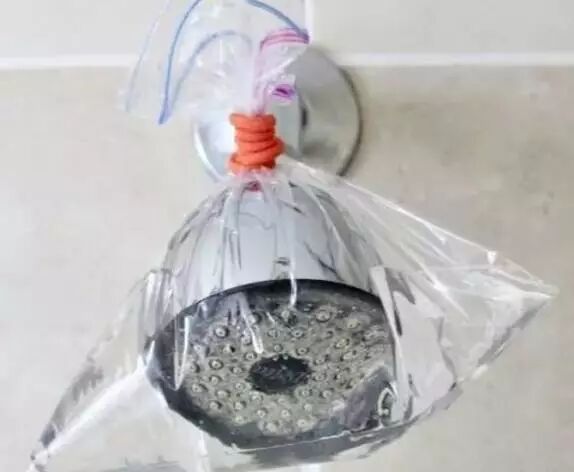 在塑料袋装中装白醋水,把淋浴头泡进白醋中