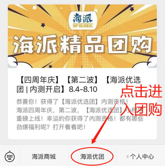 进入公众号后,在下方找到“海派优团”按钮,点击即可进入海派专属的团购小程序!