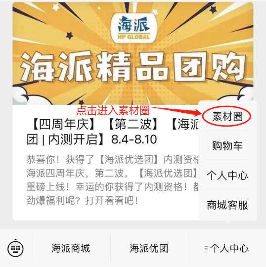 进入公众号后,在下方找到“个人中心”——“素材圈”按钮,点击即可进入素材圈小程序!