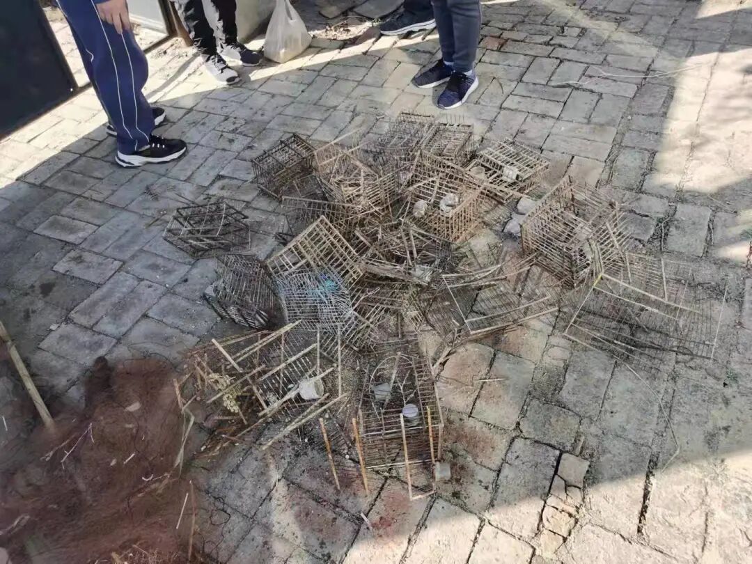 在同村另一户农家院的树上,志愿者发现拍笼4具,立刻向呼兰区林草局举报,现场收缴拍笼4具、装笼6具,放飞黄雀、普通朱雀10只。