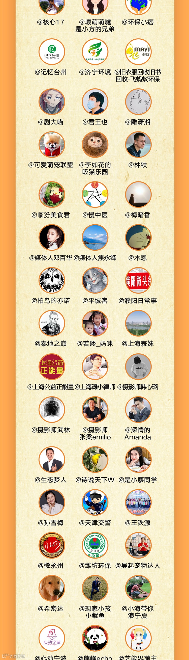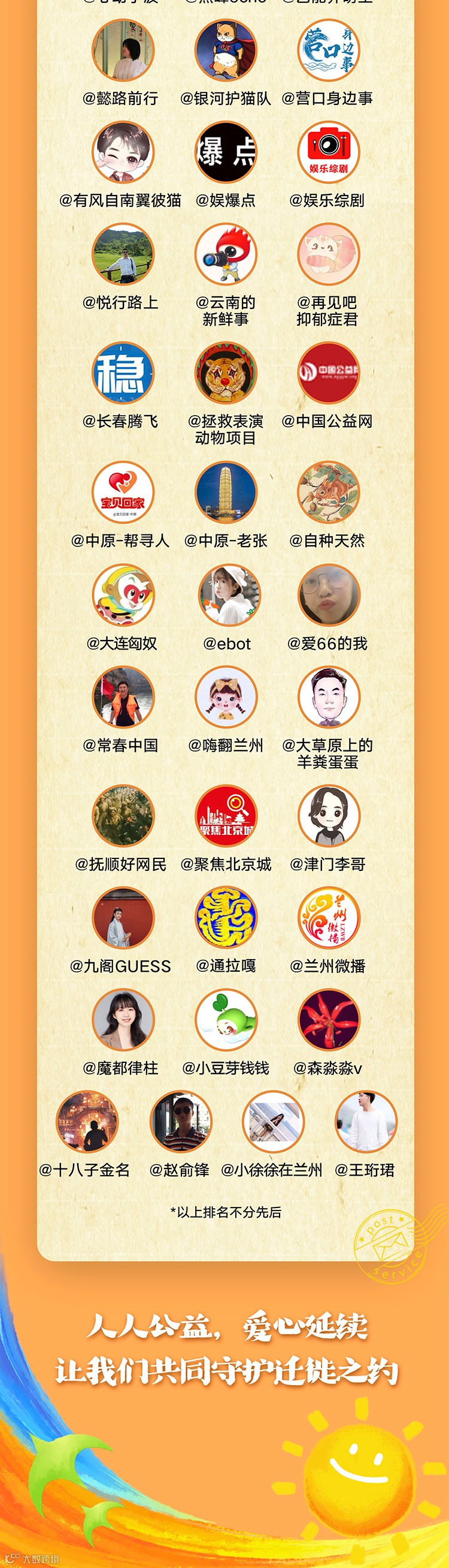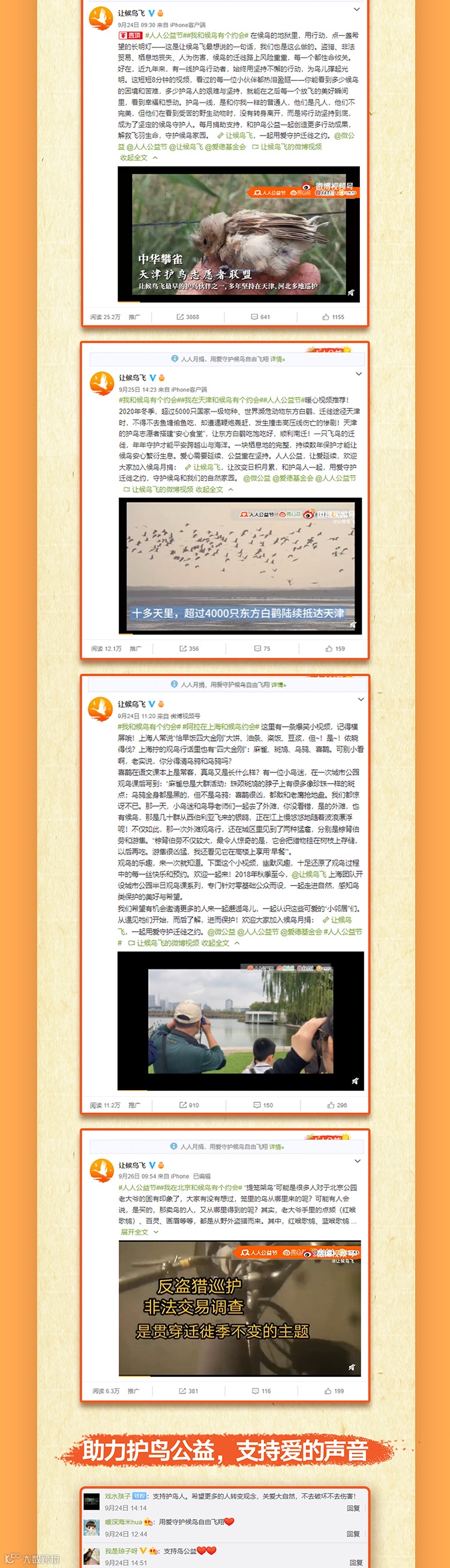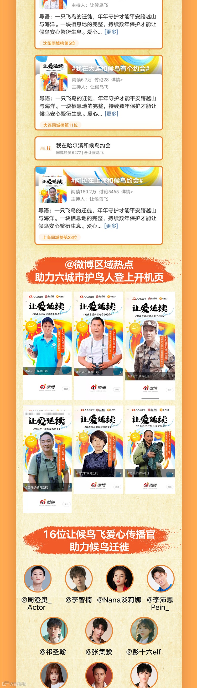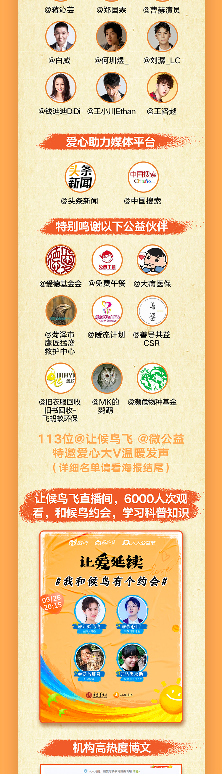 16位让候鸟飞名人爱心传播官,助力候鸟迁徙;@头条新闻、 @中国搜索、以及9个公益伙伴和机构爱心助力,113位大V博主温暖发声。