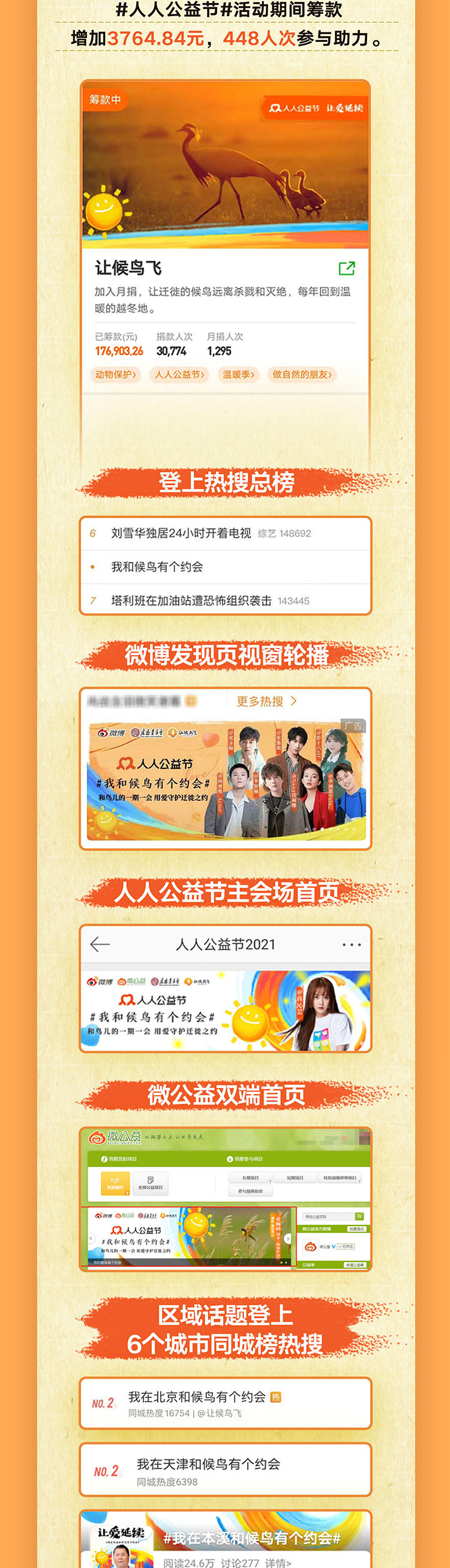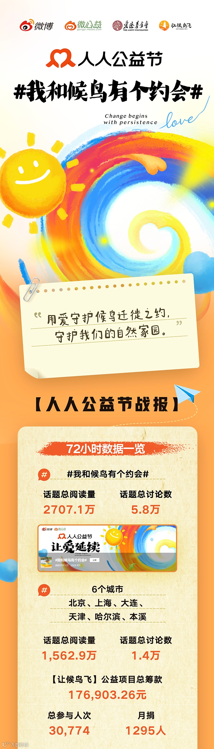 活动期间有2707.1万人次阅读话题,5.8万人次参与讨论。【让候鸟飞】公益项目总筹款176,903.26元,总参与人次 30,774,月捐1295人,活动期间筹款增加3764.84元,448人次参与助力。