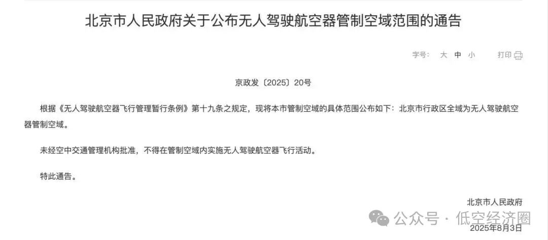 8月3日,市政府关于公布无人驾驶航空器管制空域范围的通告显示,北京市行政区全域为无人驾驶航空器管制空域。未经空中交通管理机构批准,不得在管制空域内实施无人驾驶航空器飞行活动。