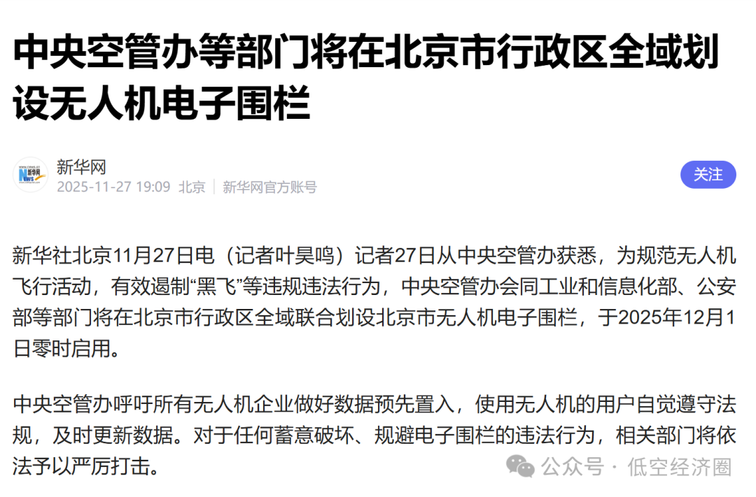 新华社消息,记者11月27日从中央空管办获悉,为规范无人机飞行活动,有效遏制“黑飞”等违规违法行为,中央空管办会同工业和信息化部、公安部等部门将在北京市行政区全域联合划设北京市无人机电子围栏,于2025年12月1日零时启用。