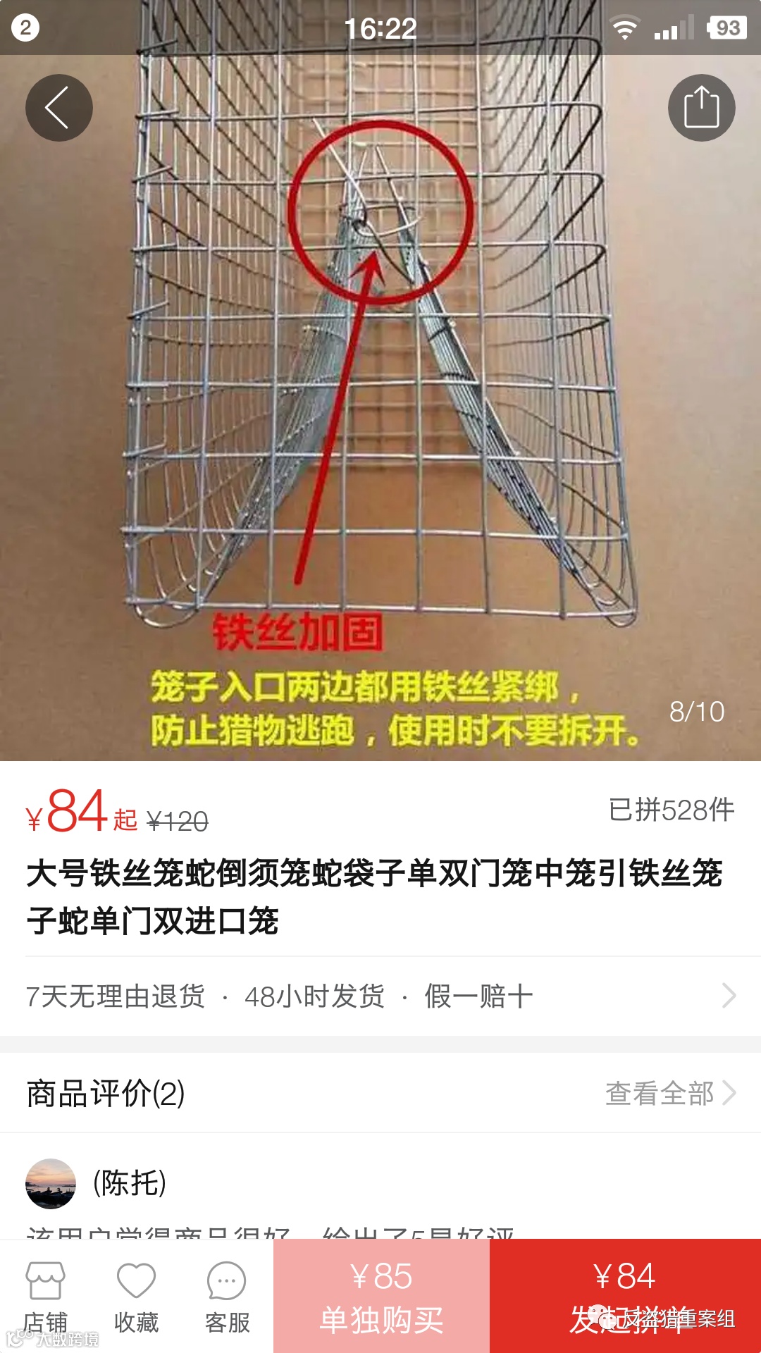 这俩都是专业捕蛇工具,蛇笼经特殊设计,里边放上鸟类、青蛙或其它诱饵(拼多多有大量在售的诱蛇粉)引蛇进笼,只能进不能出。它在平台的马甲是“装蛇铁丝笼”。