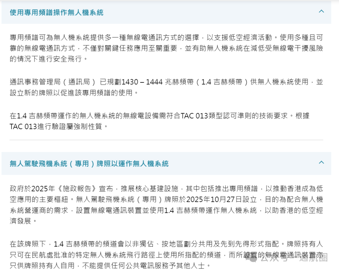 通讯局发言人表示,2025年施政报告宣布,特区政府将推展核心基建设施,包括推出专用频谱,以推动香港成为低空创新应用的核心枢纽。(李家超:香港要成为低空创新应用亚太区枢纽!将制订「发展低空经济规划行动纲领」、推进进阶版低空经济「监管沙盒 X」试点项目)在无人机(专用)牌照制度下,牌照持有人可获指配1430-1444 兆赫频带(1.4吉赫频带)作为专用频谱,用于设置、维持及操作用于营运无人机系统的无线电通讯装置,进一步支持无人机安全高效运行,在通讯网络方面全力支持低空经济生态圈的建设。