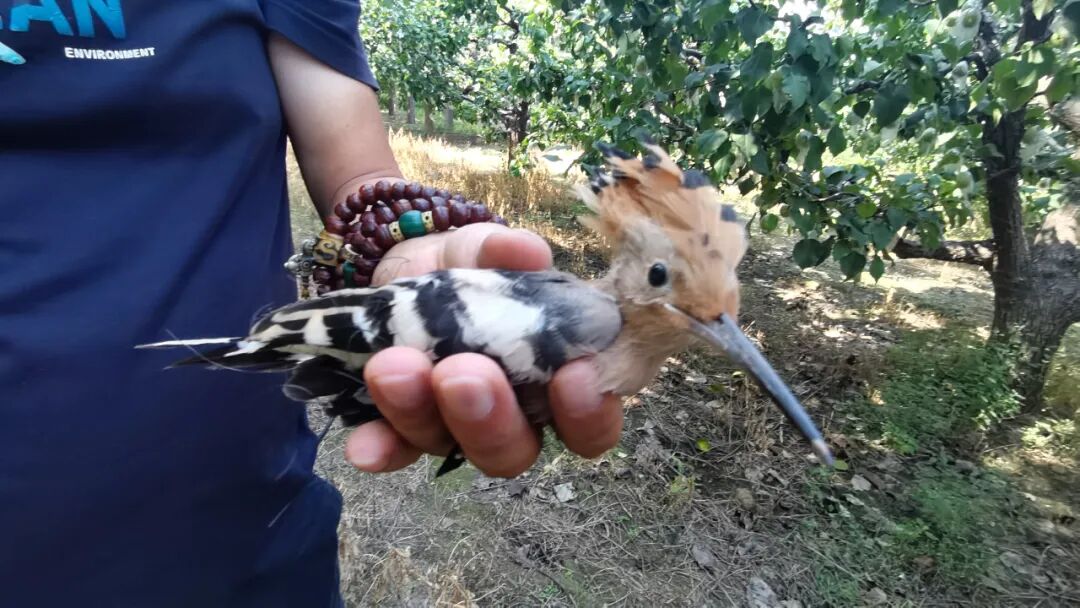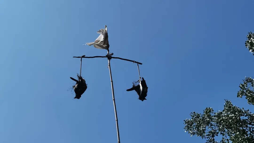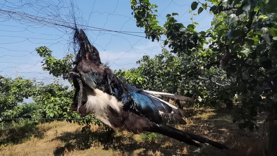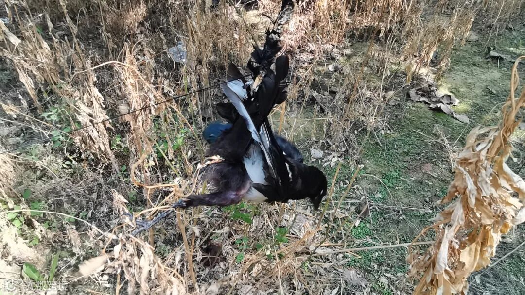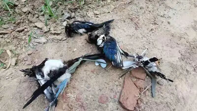 志愿者在网上解救下戴胜1只、喜鹊1只,网死的喜鹊4只、戴胜1只、麻雀1只、还有1只杜鹃幼鸟。高架的杆子上还挂有2两只死去的喜鹊尸体。