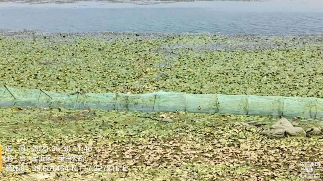在西青区中亭河发现大量地笼网,接到举报后当地政府部门及时到现场处理地笼网。