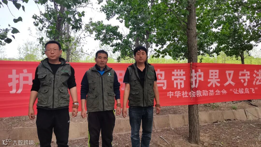 天津护鸟志愿者在西青,北辰老猎场巡护,对种葡萄种植户宣传普法,发放驱鸟带,悬挂宣传布标。