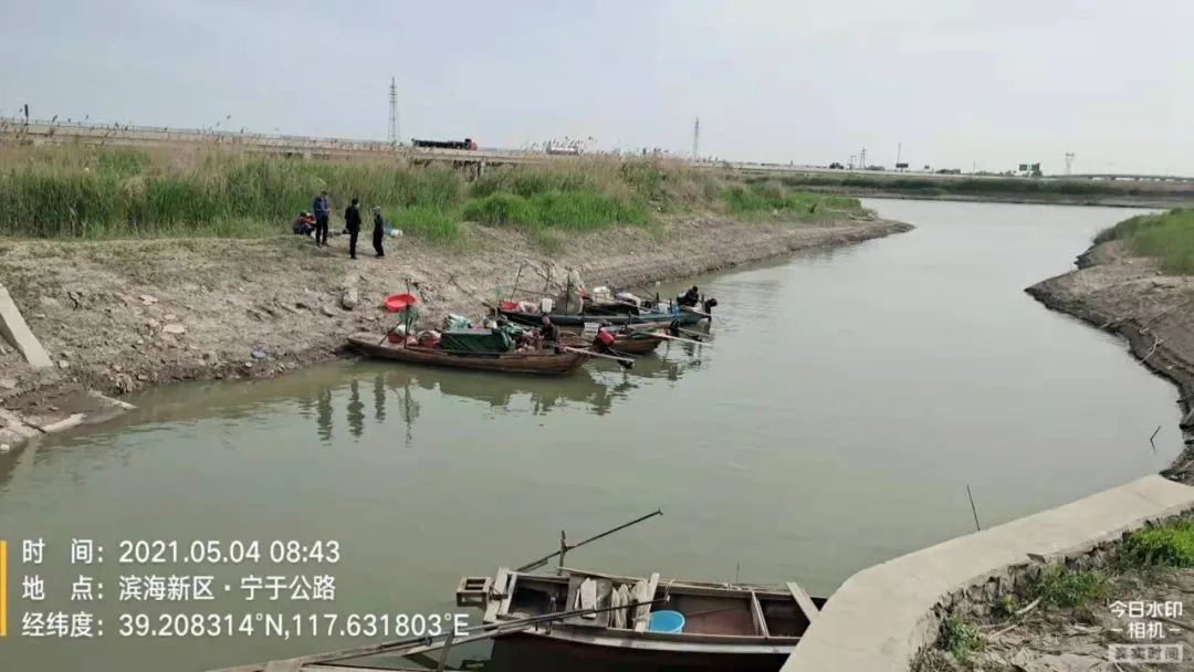 志愿者来到天津市滨海新区于家岭大桥南潮白新河巡护,发现有多条捕鱼船、捕鱼虫子船,和地笼网。举报到110、渔政部门及河长办。