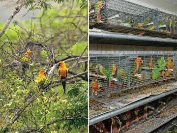 左:太阳鹦鹉在牠们南美的栖息地,和多达30只的群体一起生活,右:在佛罗里达繁育场的太阳鹦鹉,很快就会和伙伴分离,进入宠物市场。来源:hsus