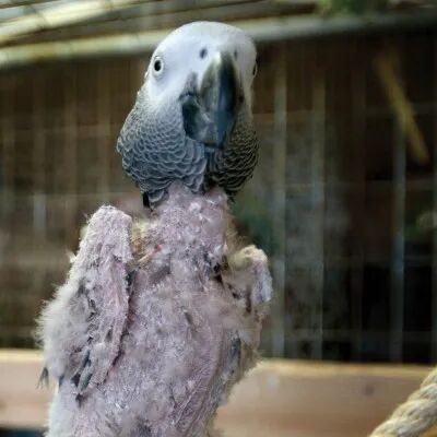 这只非洲灰鹦鹉是被解救出来的,牠已经拔光了自己身上的羽毛。来源:hsus