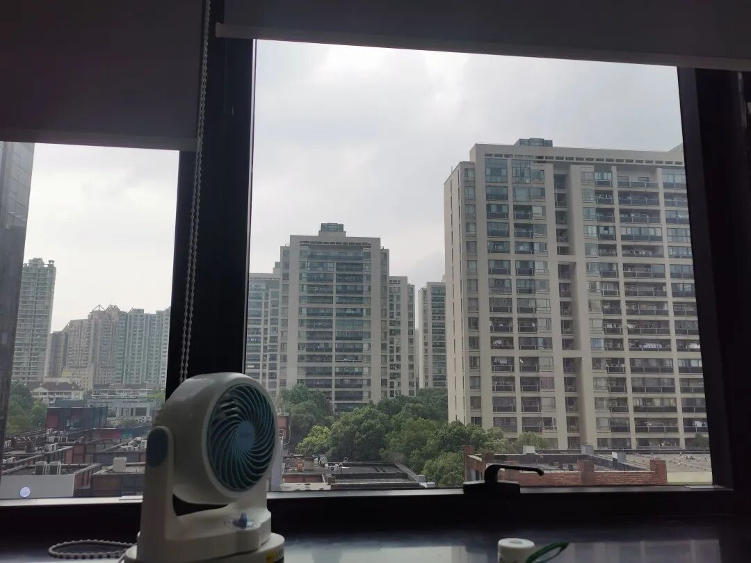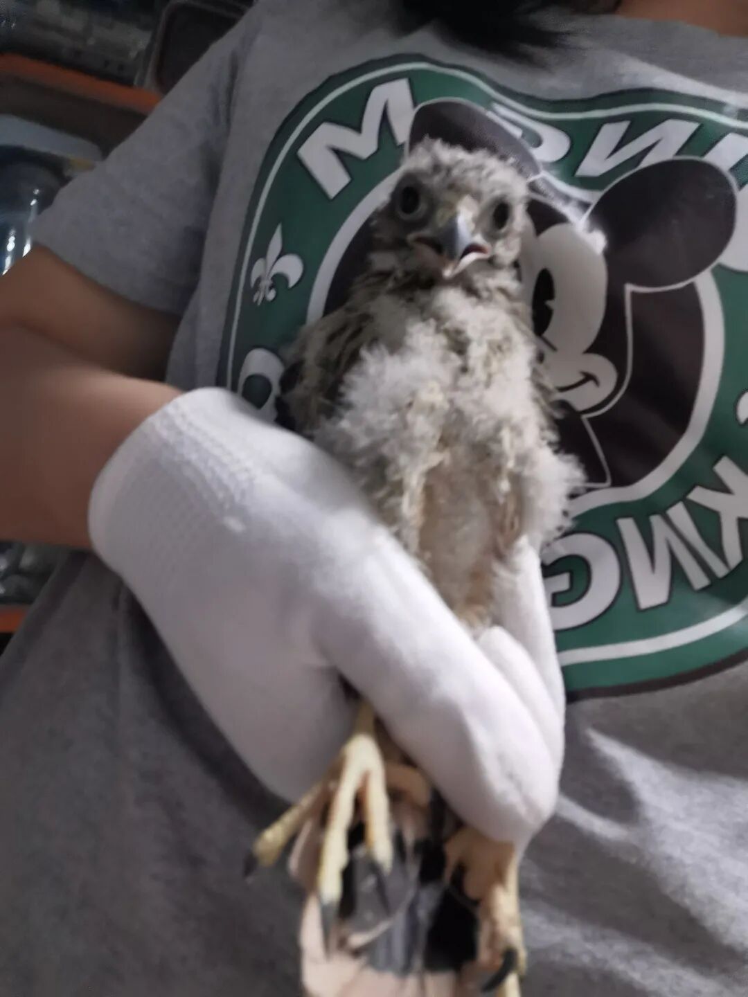 小红隼被发现的巢区(倒数第4层百叶格内可见亲鸟停留)以及它落巢时的样子