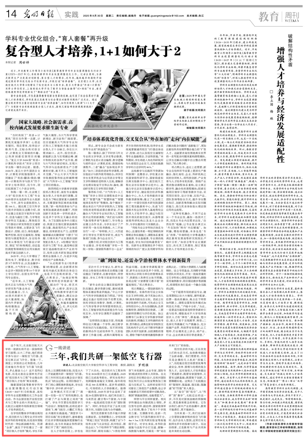 据北京航空航天大学10月10日消息,日前,光明日报教育周刊“复合型人才培养1+1如何大于2”专栏以《三年,我们共研一架低空飞行器》为题,讲述北航在全国首批开设的“低空技术与工程”专业推出的“项目制人才培养”模式——