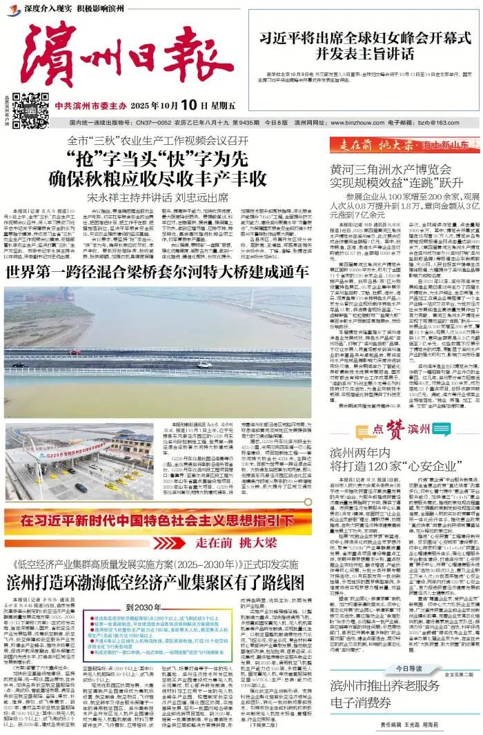 滨州日报/滨州网讯 近日,由市发展改革委牵头制定的《低空经济产业集群高质量发展实施方案(2025-2030年)》(以下简称《方案》)正式印发实施,旨在深度融入国家、省低空经济产业发展格局,统筹低空制造、低空飞行、低空保障和低空服务产业发展,构建全产业链条,推动多场景应用,促进产教深度融合,服务保障达到国内先进水平,打造滨州区域经济发展新增长极。