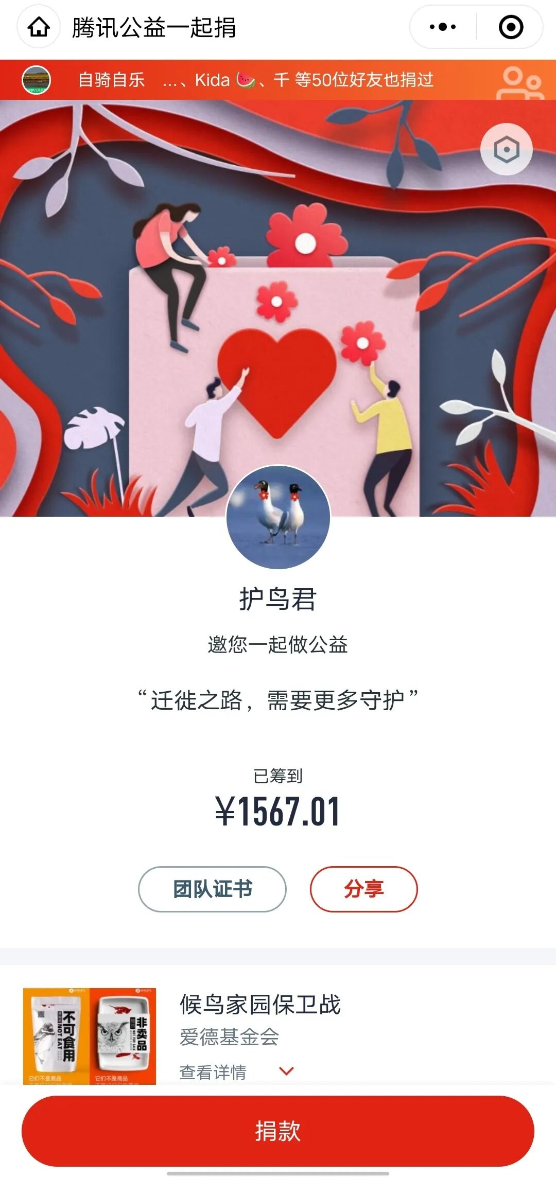 根据今年的99公益日规则,若是邀请亲友“送花、答题、捐1元”,还能获得最高配捐,护鸟君已在招募护鸟侠进行攒花,可助力每一位爱心大使,完成配捐加成。您也可以组建自己的花神群,争取腾讯基金会的高配捐。