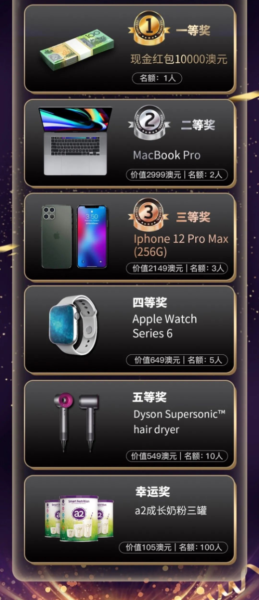 每位在上方公众号上传单号的小伙伴,都将获得一个抽奖码,在活动结束后参加直播抽奖! 一百多个获奖名额,更有10000澳元现金大奖等你来!