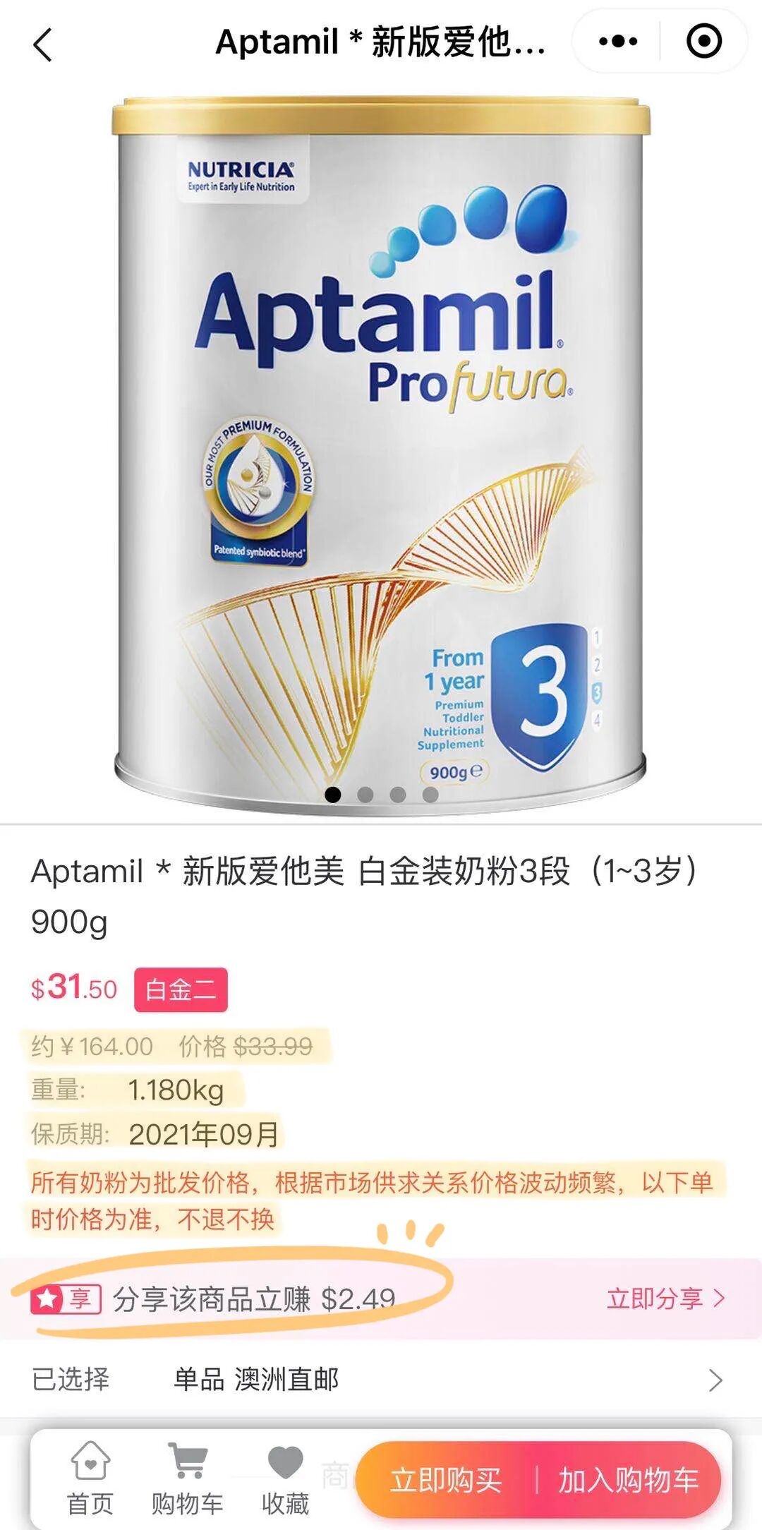 在这个页面,我们可以清晰的看到自己的会员级别所对应的价格、原价、人民币估算价、重量、保质期、红色特殊说明、邮寄方式,以及最重要的分享立赚金额!