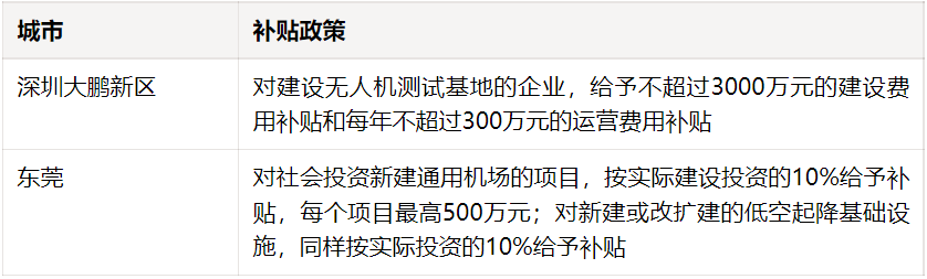 从表格可以看出,在基础设施建设方面,各城市补贴力度较大。深圳大鹏新区对无人机测试基地建设与运营的补贴,有助于企业降低成本,推动无人机产业发展。东莞对通用机场及低空起降基础设施建设的补贴政策,旨在完善低空经济硬件设施,为产业发展奠定基础。