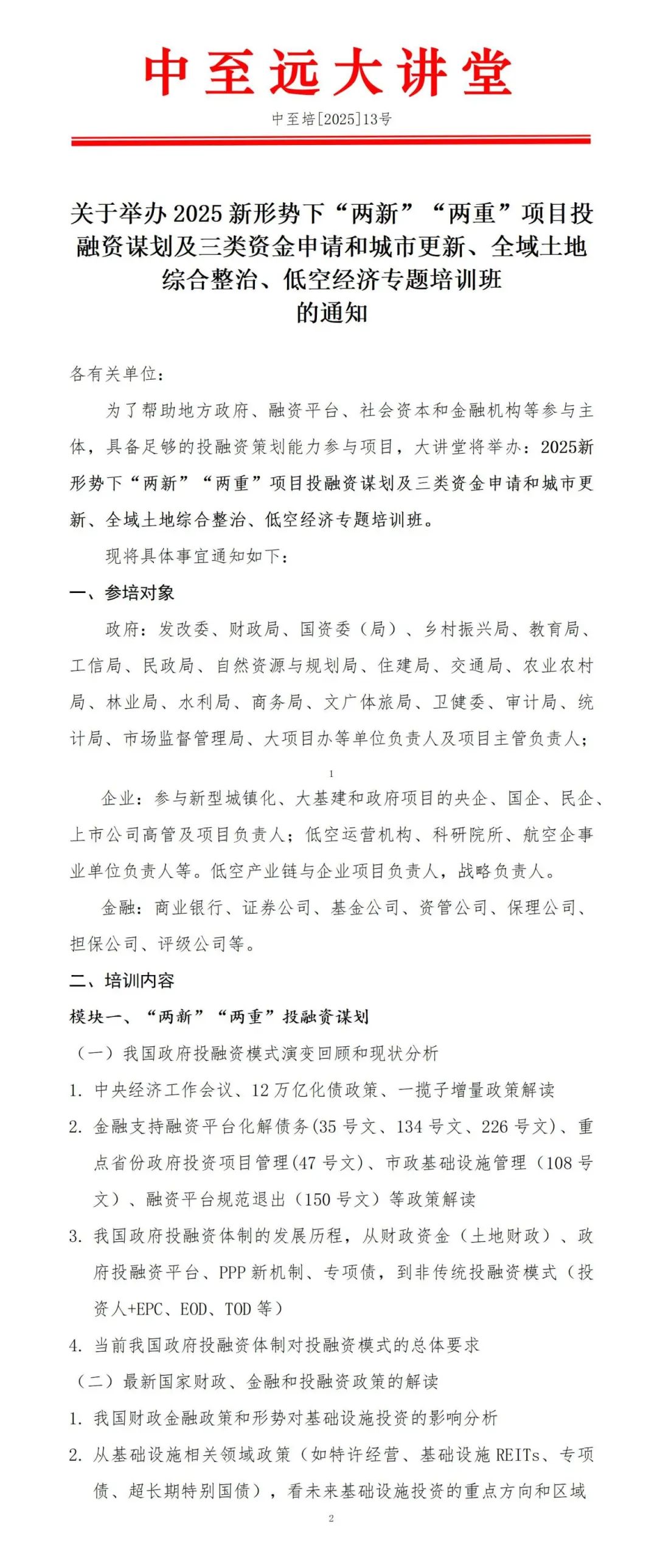 两新、两重、中央资金申报、专项债、全域土地综合整治、城市更新、低空经济及项目融资实操,9月18-21日成都(报名中),11月19-21日郑州。详情可联系张老师获取课纲文件13718710171(同微信)承接地方政府、城投、协会、央国企、集团各种企业定制内训课、全国公开课及咨询业务,欢迎您的加入!