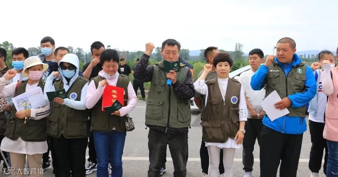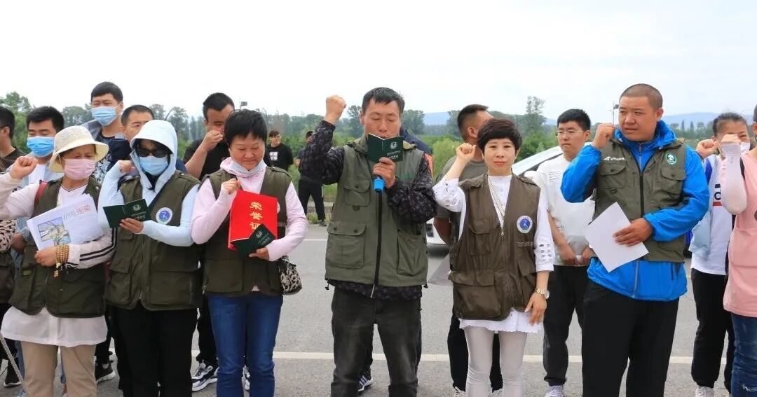 让候鸟飞护鸟伙伴文圣区野生动植物保护协会会长马起家带领志愿者进行宣誓:尽己所能,不计报酬,践行志愿精神,保护野生动植物……