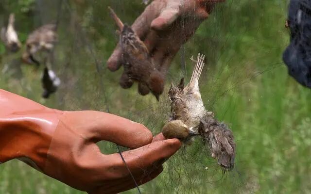 在清理一处江湾内的渔网时,志愿者在临近的树林中,发现4片捕鸟网,上面“粘”着60多只伯劳、柳莺等鸟,其中5只,是刚被粘住不久的活鸟,志愿者迅速拆网,把它们放飞。其余的50余只死体,志愿者进行了无害化处理。